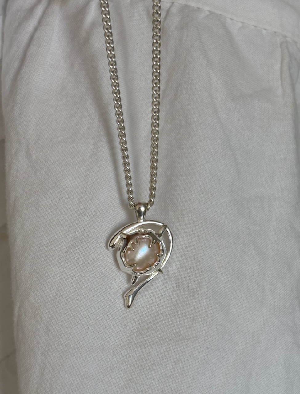 This piece draws on the juxtaposition of the raw and the refined, merging the sharp, metallic edge of separation with the organic, soft glow of the pearl. The half-heart symbolises a bond that is fractured yet still precious, a strength born from vulnerability. Suspended from a sleek, dark chain, heart of the sea mimics the contrast of the ocean; a symbol of resilience that is as delicate as it is sharp.